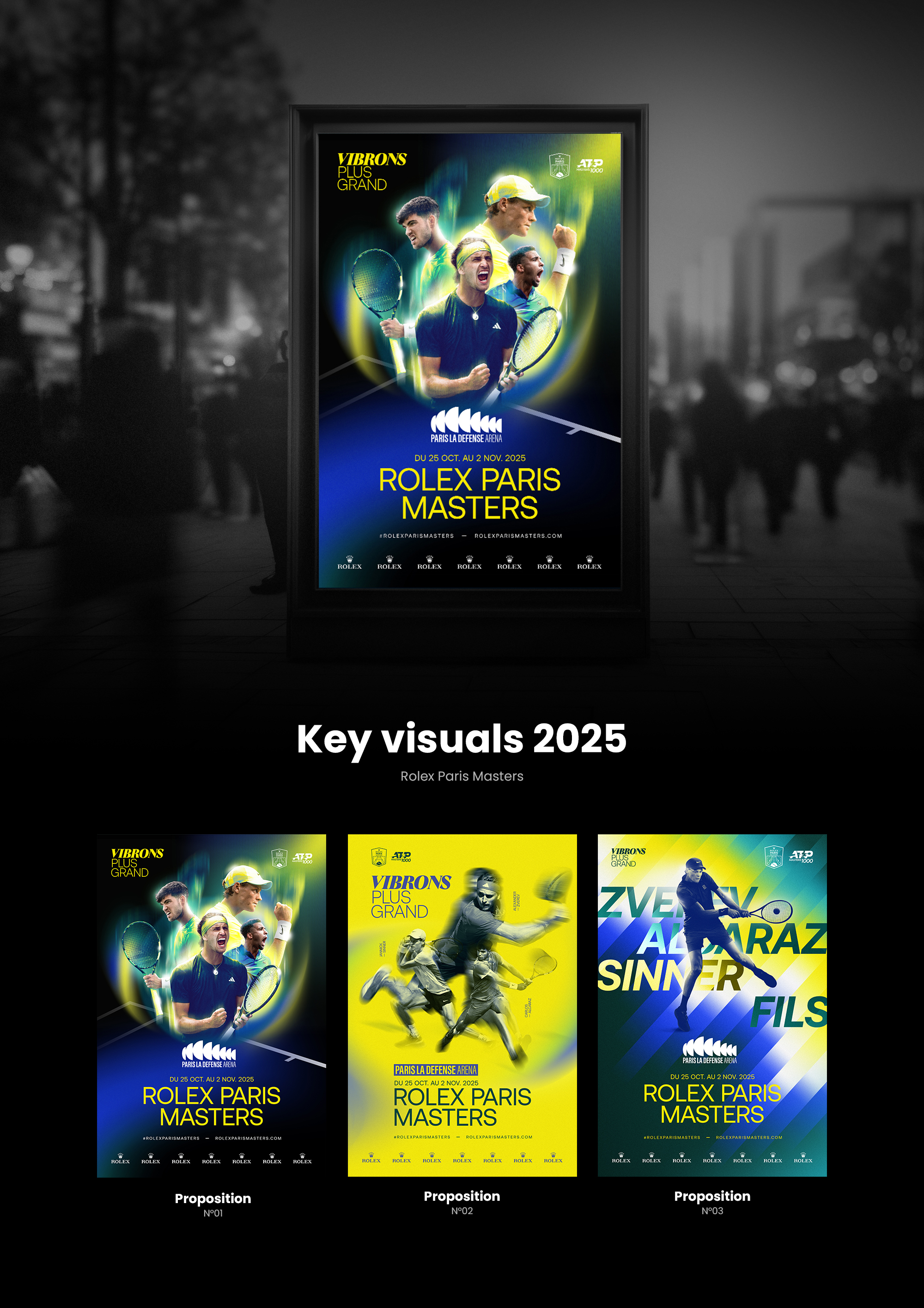 Propositions de 3 visuels promotionnels pour le tournoi Masters 1000 de Paris à La Défense Arena.